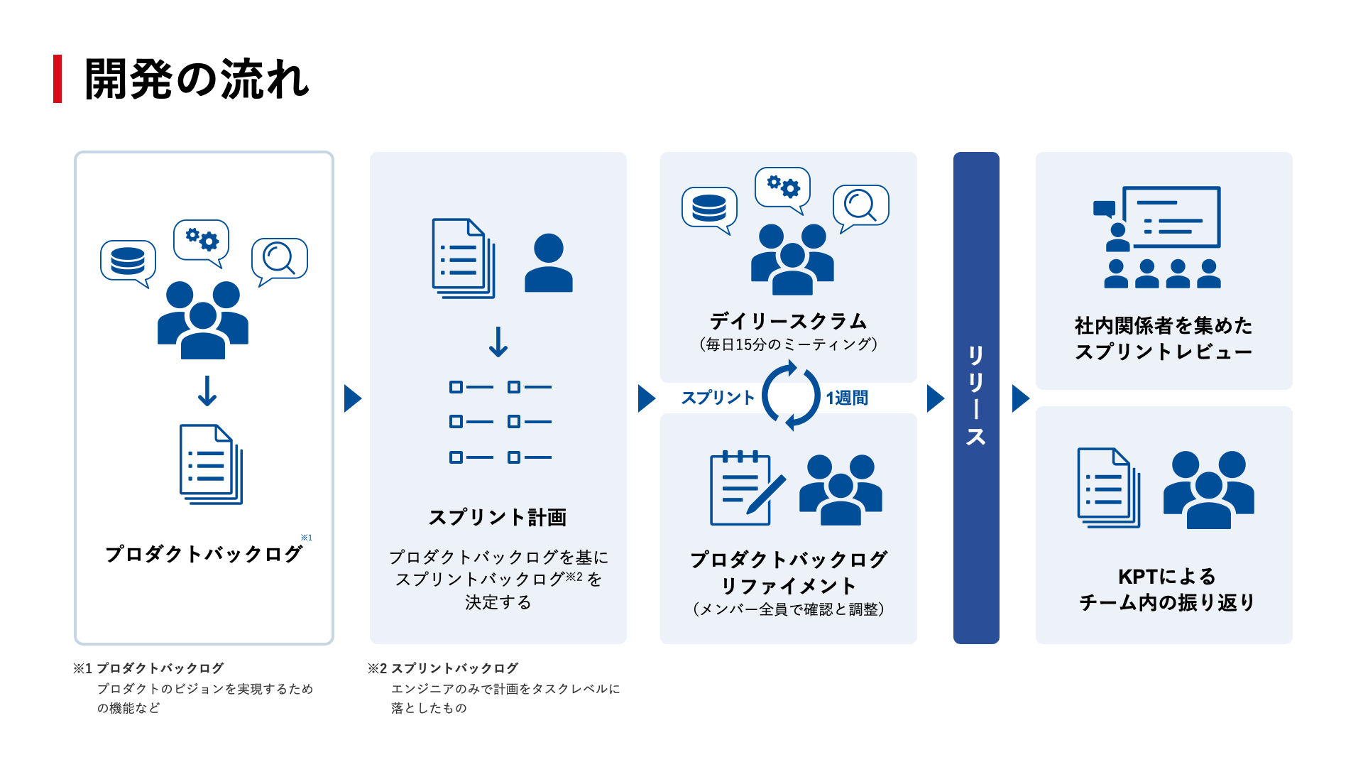 スクラムをベースとしたアジャイル開発を行っており、多くのチームが1週間のスプリントを回しています。